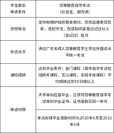 根据《广东技术师范大学成人高等教育学士学位授予工作细则》(广师大[2019]445号)文件规定,我校自考毕业生可于2021下半年申请成人高等教育学士学位,现将有关事项通知如下。