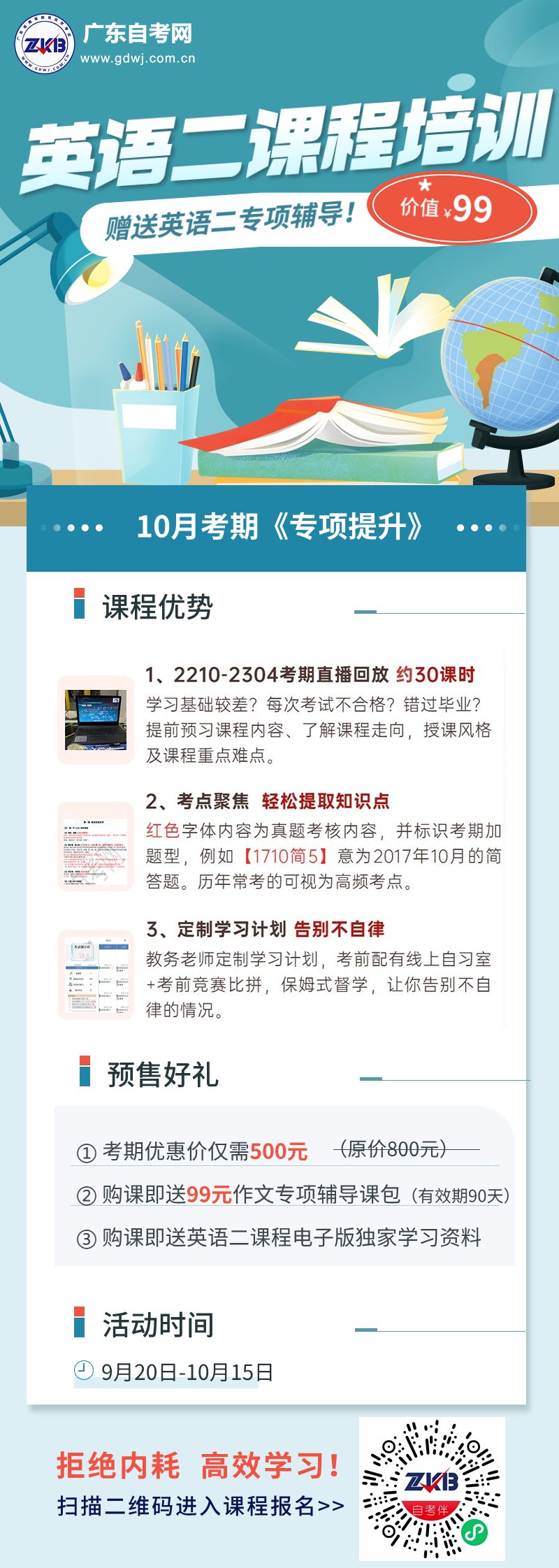 所在位置:广东省自考网 > 复习资料 > 考试资料 > 广东自考10月考期英语二专项培训课程抢先报名!