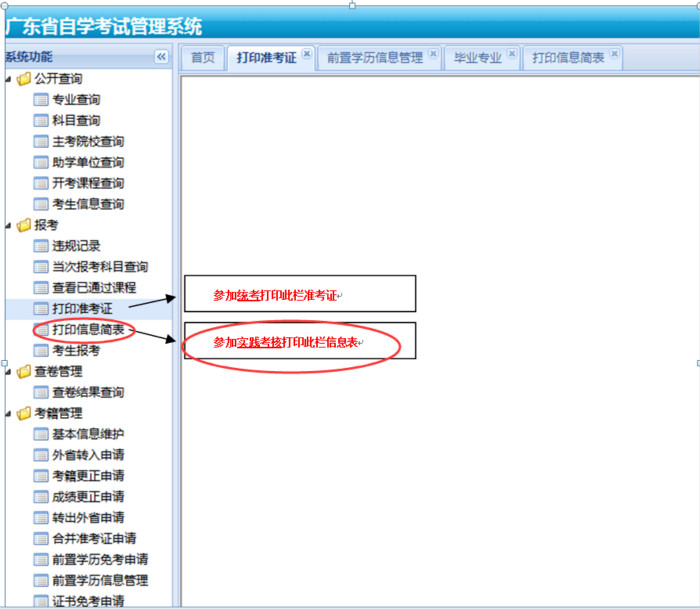 2、考生信息简表请登录广东省自学考试管理系统(https://www.eeagd.edu.cn/selfec/)自行打印,如图: