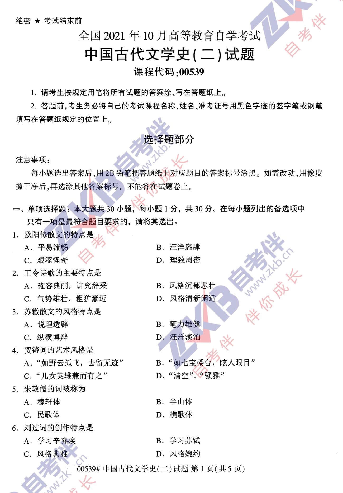 2021年10月广东自考00539中国古代文学史(二)真题试卷