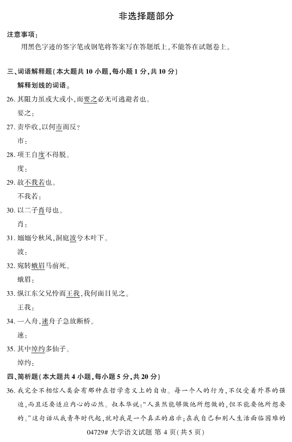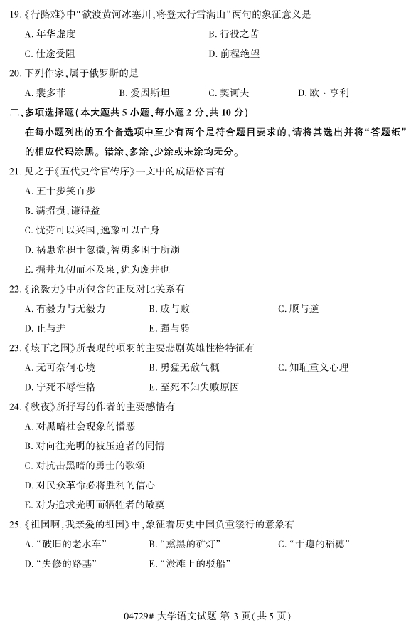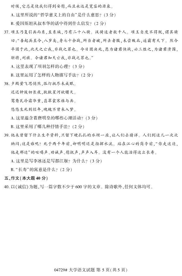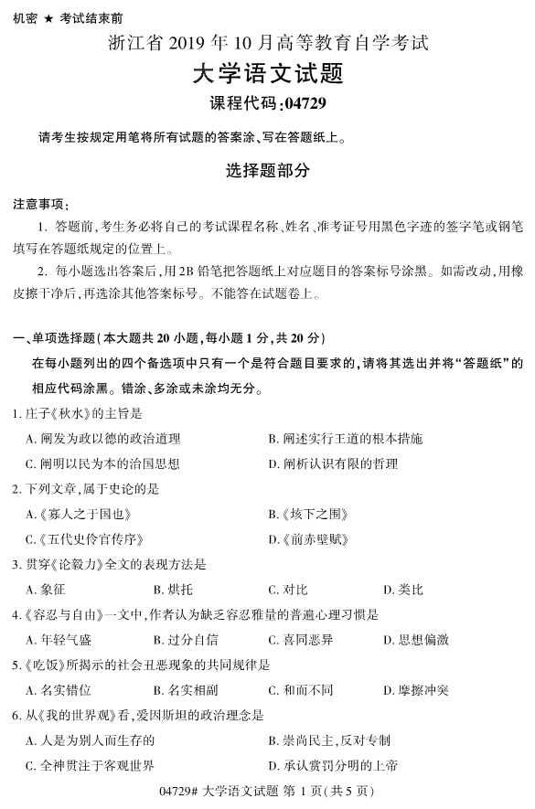2019年10月自考04729大学语文试题