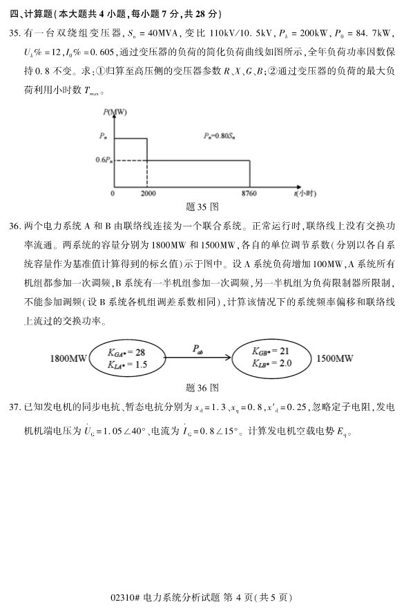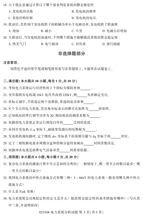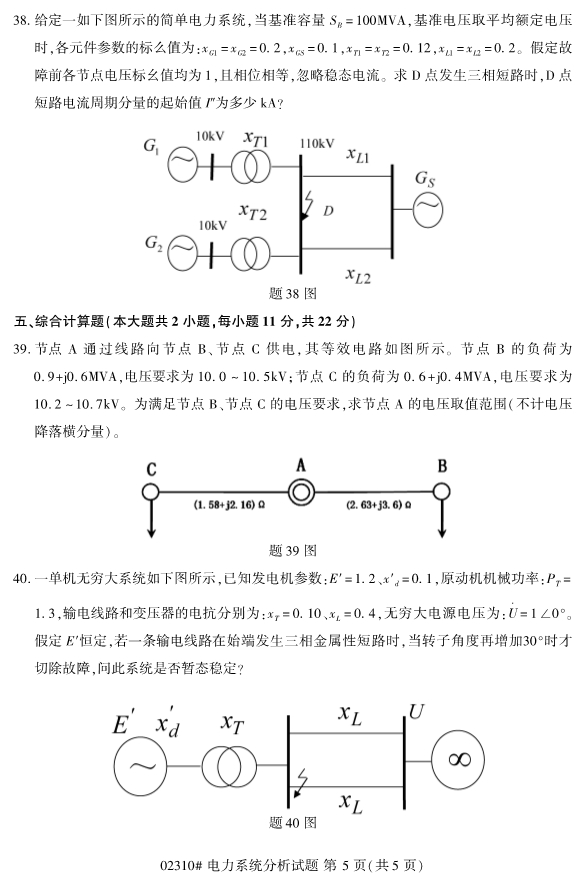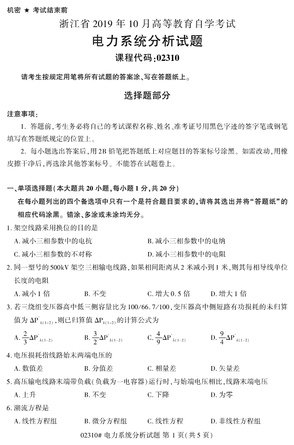 2019年10月自考02310电力系统分析试题