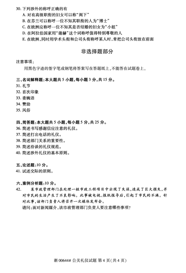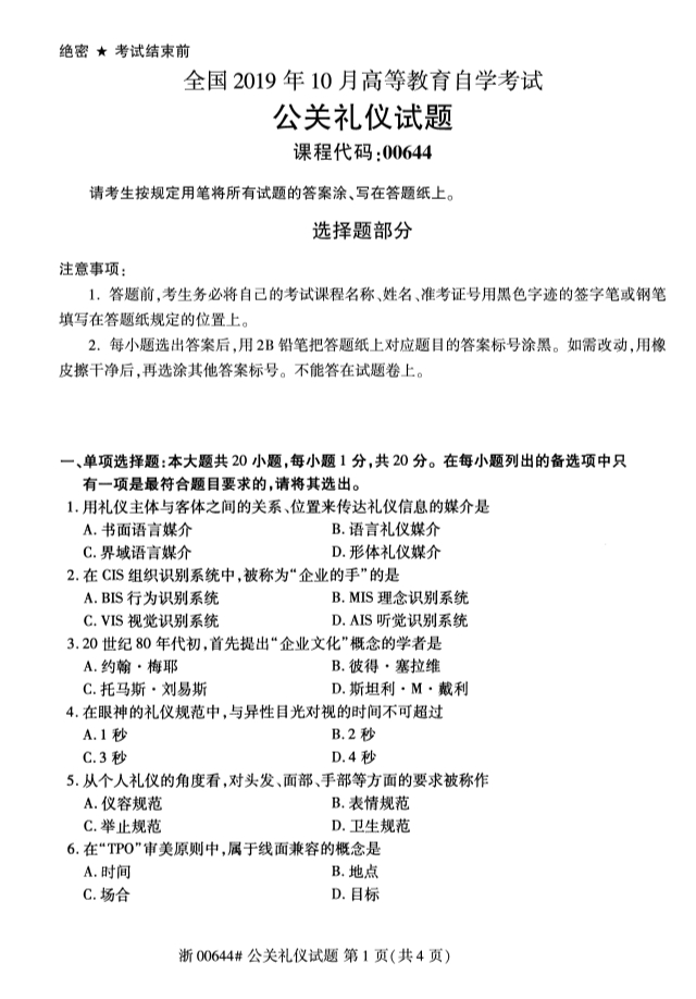 全国2019年10月自考00644公关礼仪试题