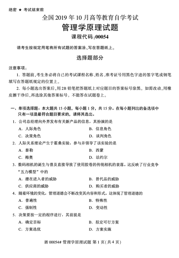 全国2019年10月自考00054管理学原理试题