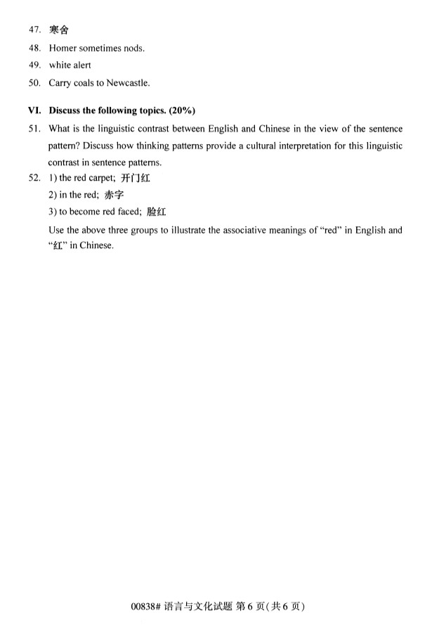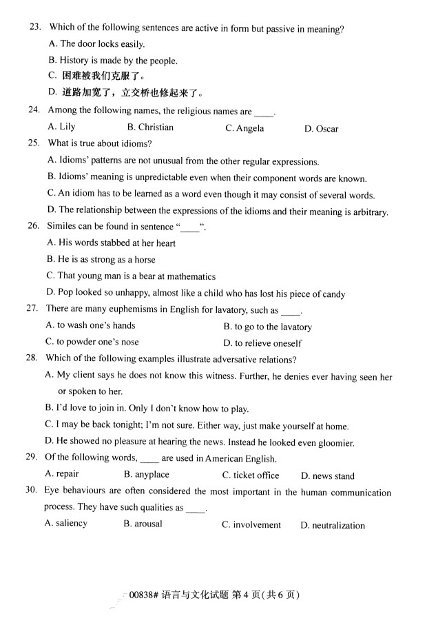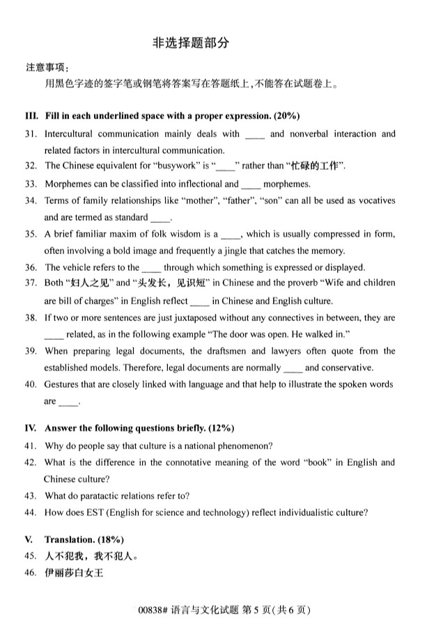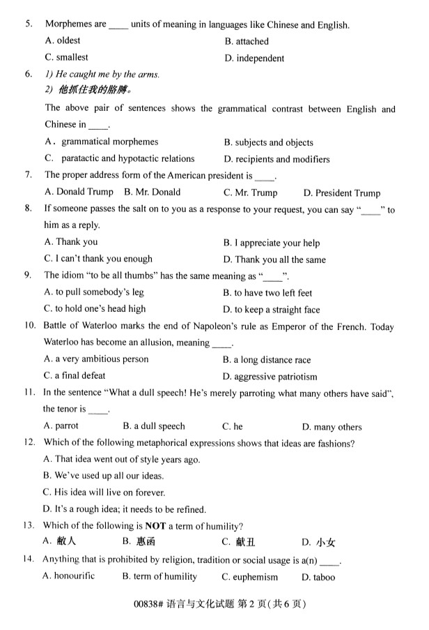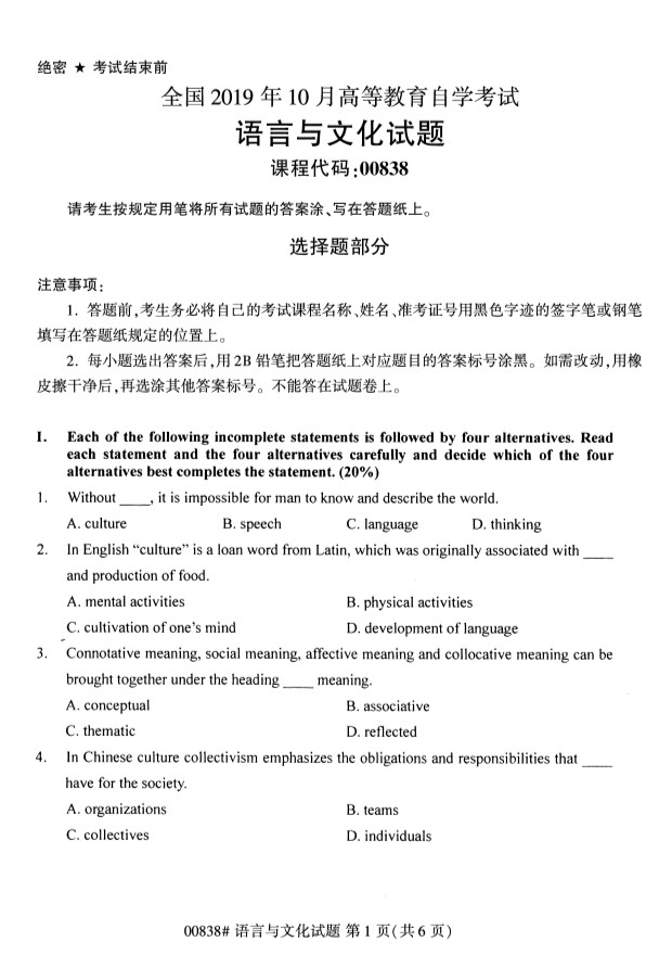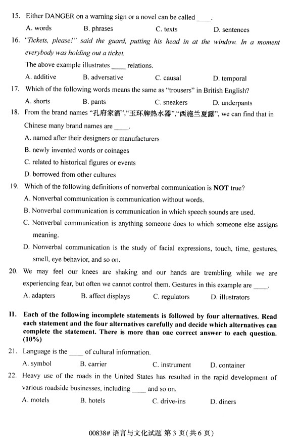 所在位置:广东省自考网 > 试题题库 > 自考试卷 > 全国2019年10月自考00838语言与文化试题