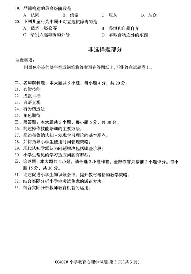 全国2019年10月自考00407小学教育心理学试题