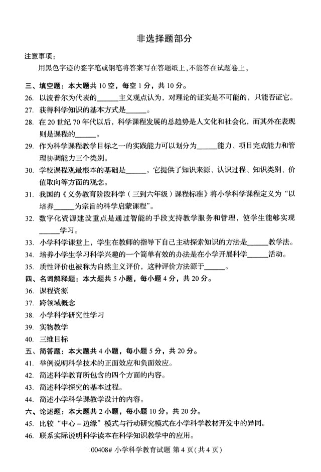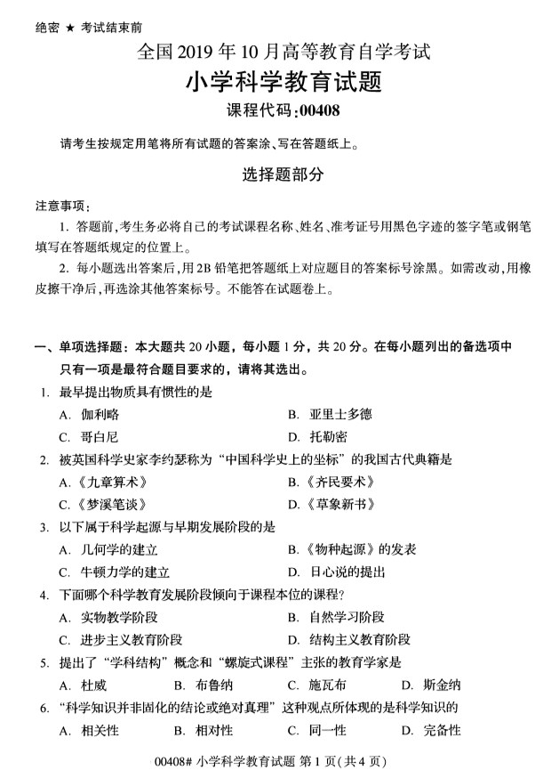 全国2019年10月自考00408小学科学教育试题