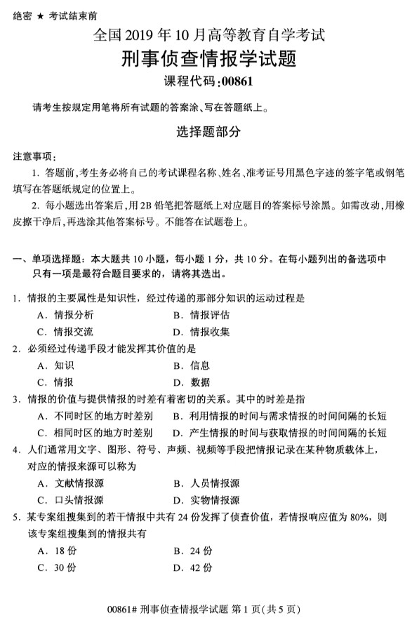 所在位置:广东省自考网 > 试题题库 > 自考试卷 > 全国2019年10月自考00861刑事侦查情报学试题