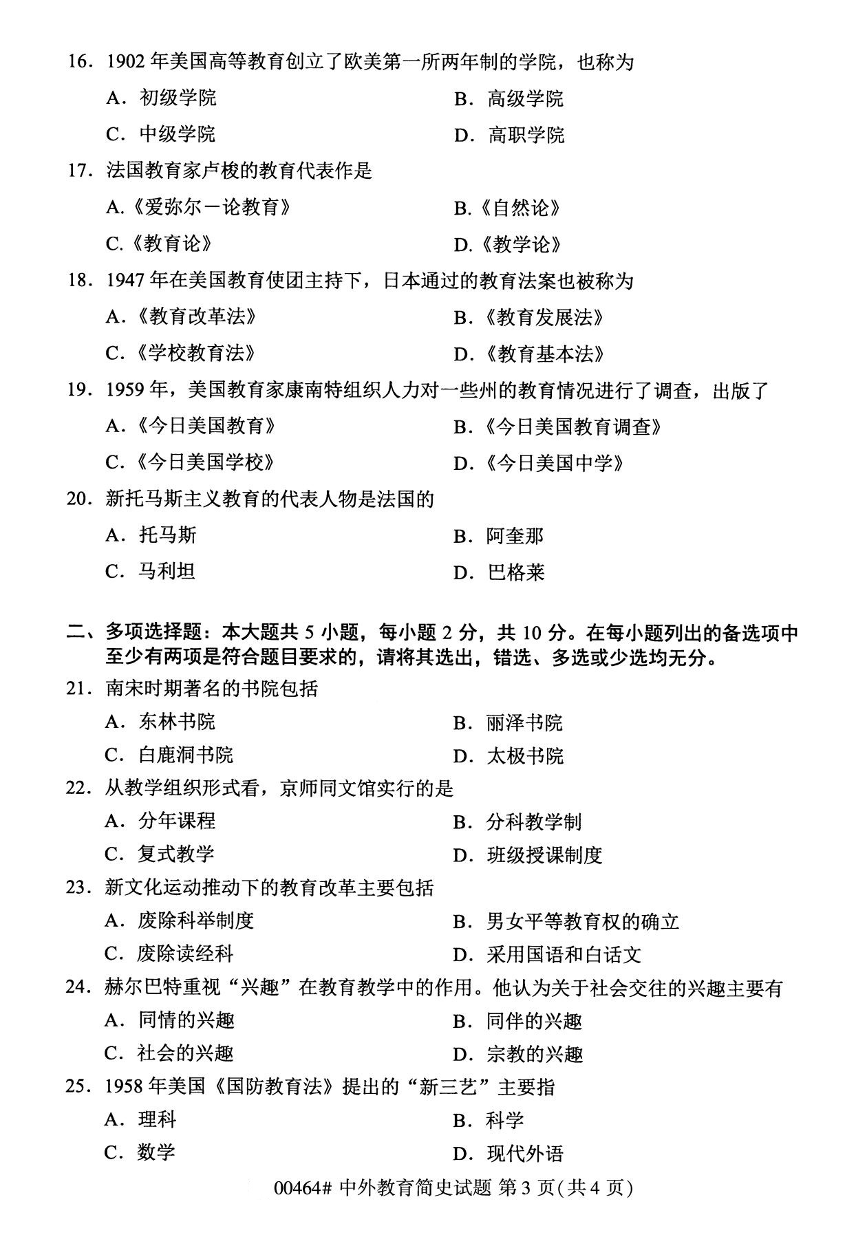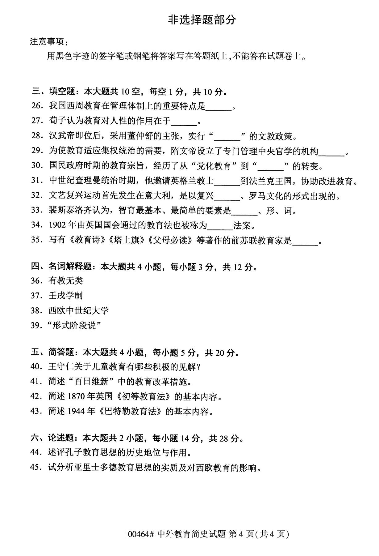 全国2020年8月自学考试本科00464中外教育简史试题