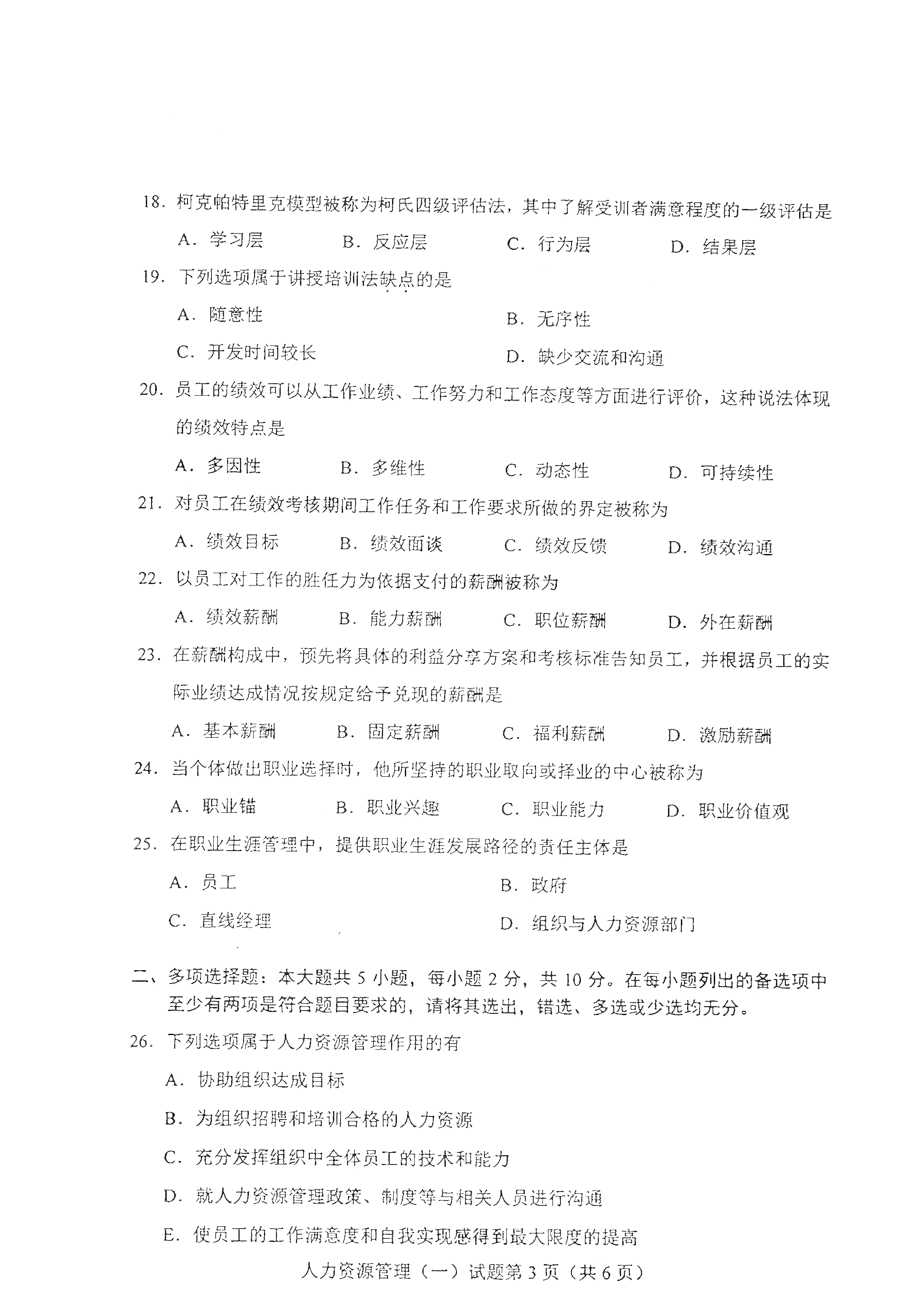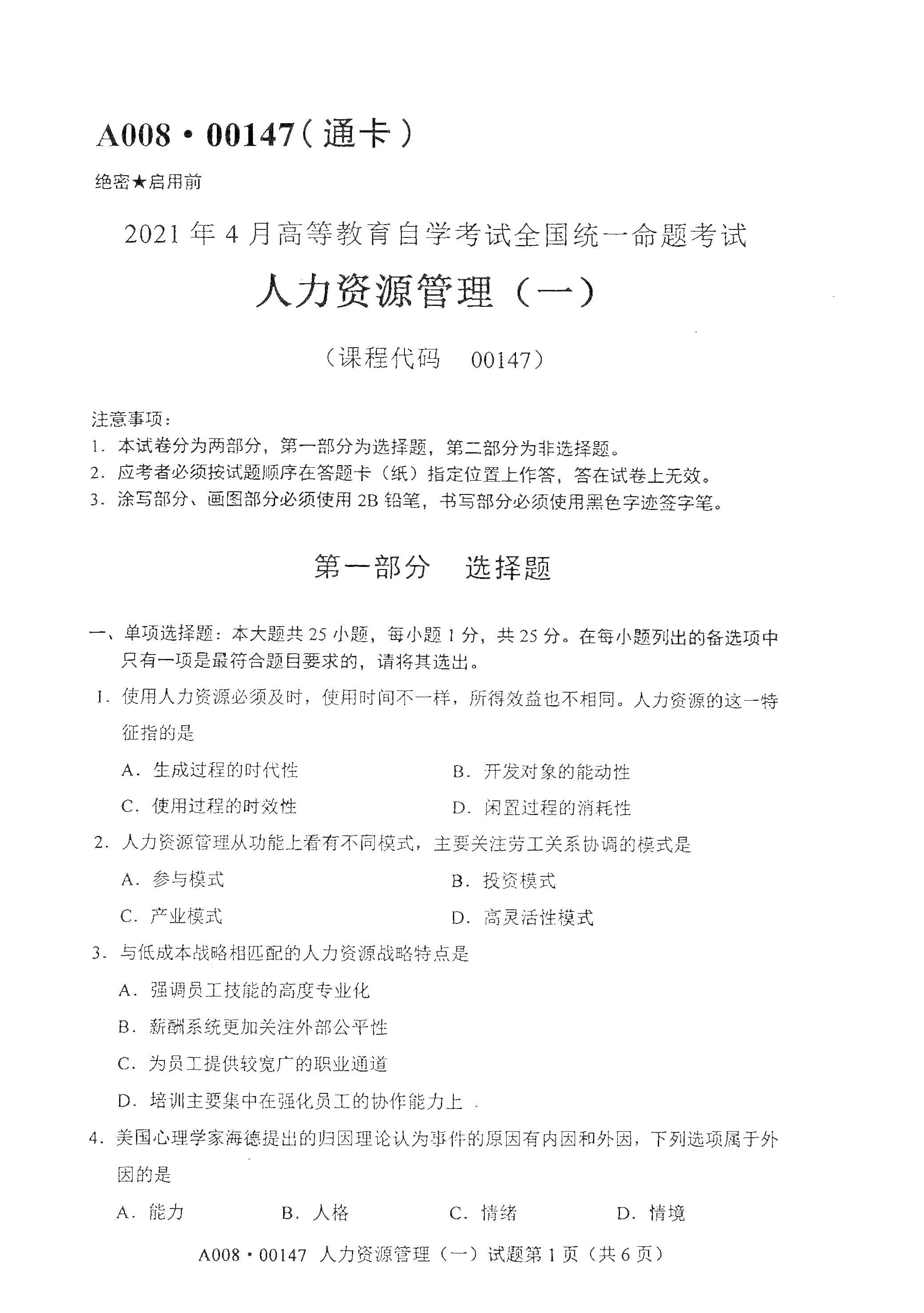 广东自考2021年4月自考00147人力资源管理(一) 真题试卷