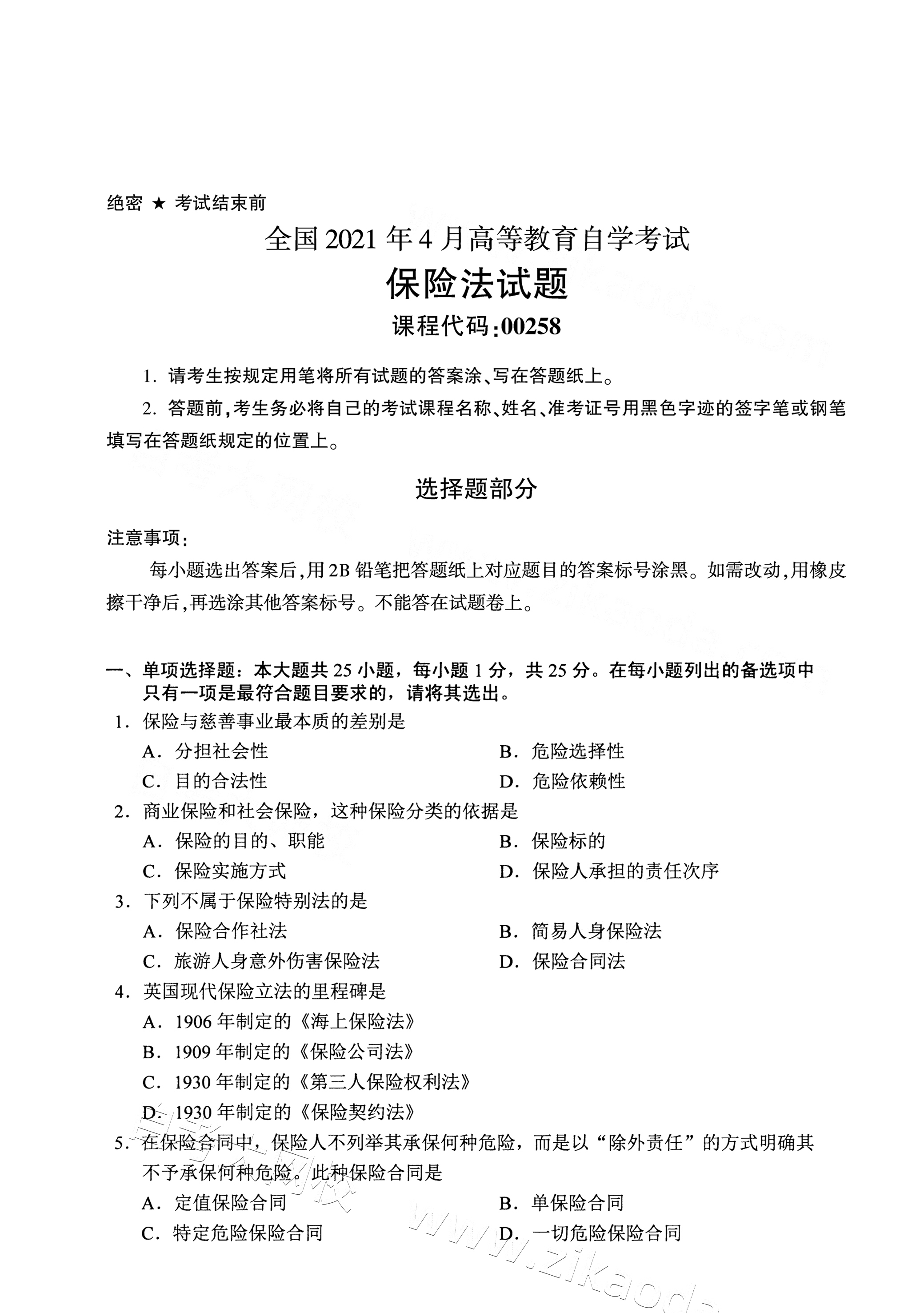 2021年4月自考00258保险法真题试卷内容,如有疑问可咨询【关注“广东省自考服务中心”微信公众号