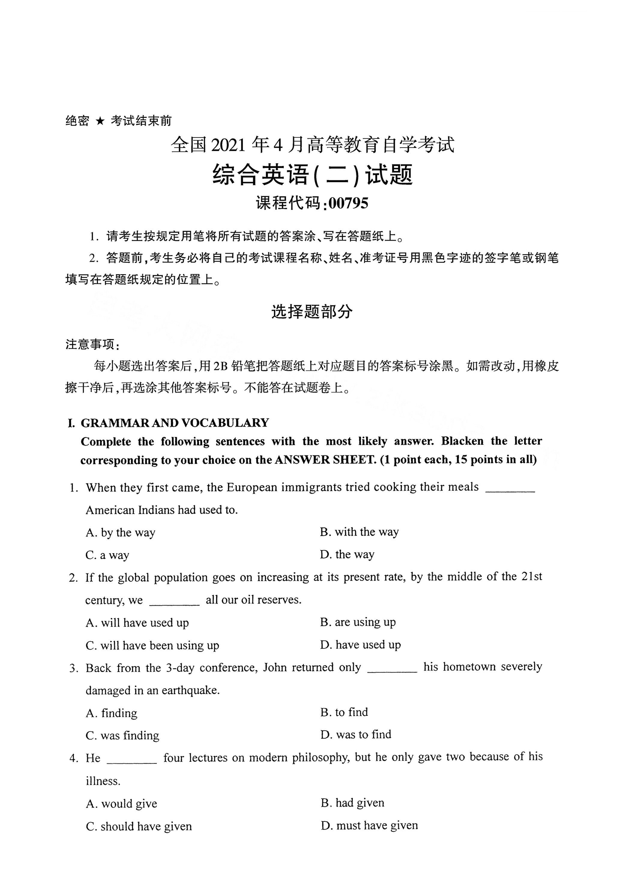 以下是2021年4月自考00795综合英语(二)真题试卷内容,如有疑问可咨询【关注“广东省自考服务中心”微信公众号