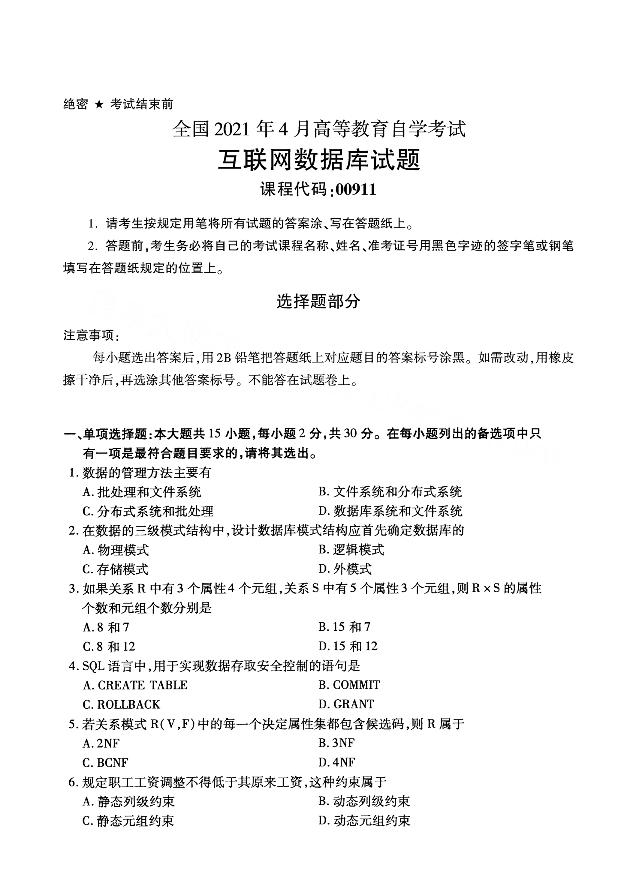 广东自考2021年4月自考00911互联网数据库真题试卷