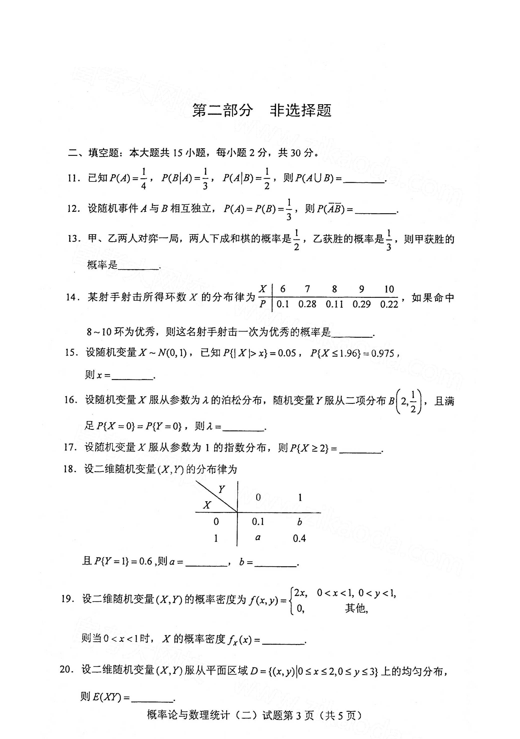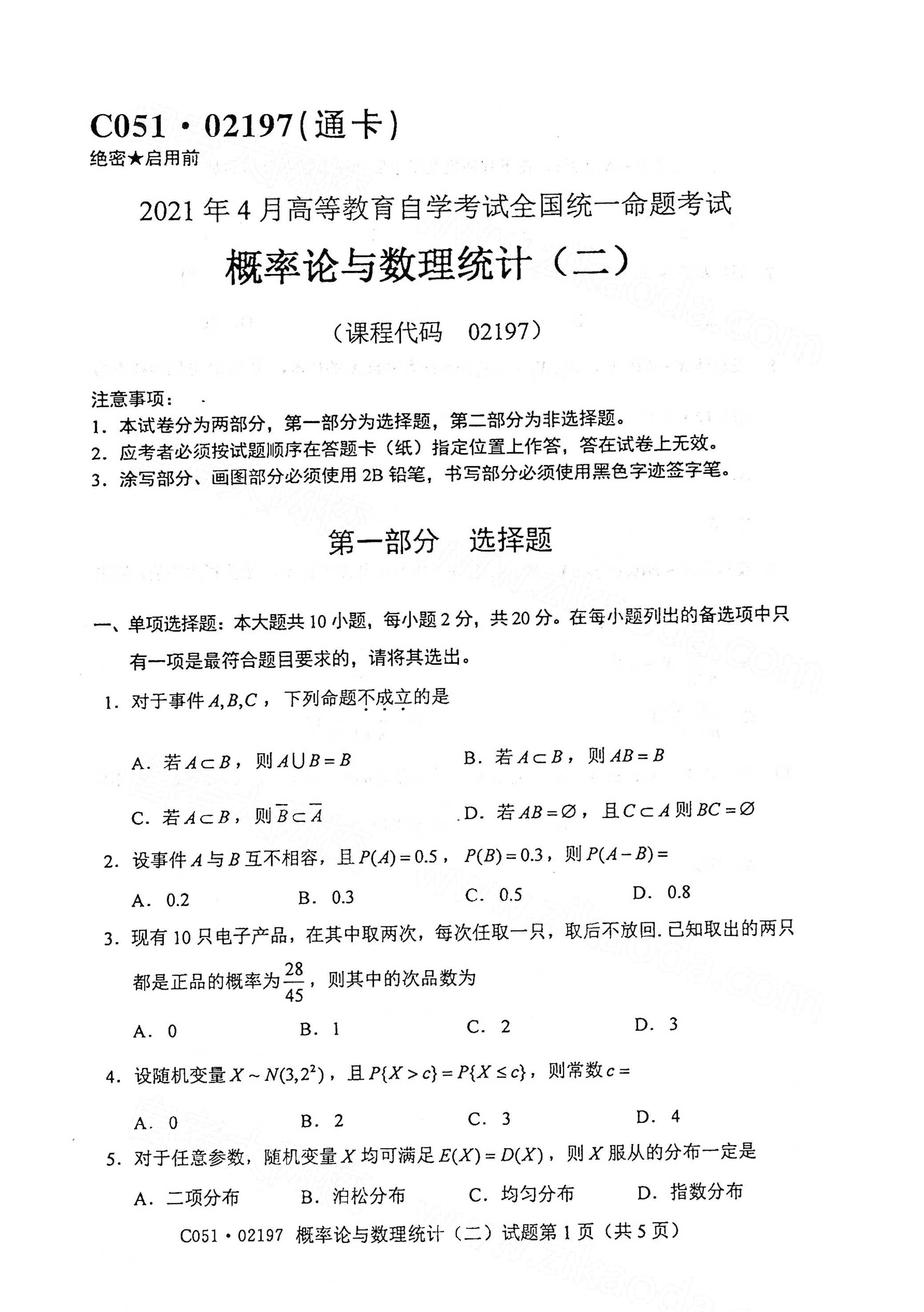 以下是2021年4月自考02197概率论与数理统计(二)真题试卷内容,如有疑问可咨询【关注“广东省自考服务中心”微信公众号