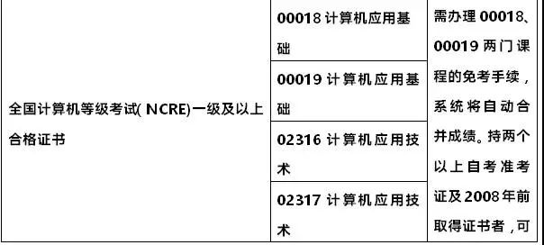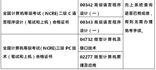 持有英语等级证书、计算机等级证书等可免考相关专业。比如,通过国家英语等级考试获得三级或以上证书(或笔试部分成绩合格);大学毕业生在校内参加校考,取得大学英语四、六级证书,并在有效期内,可免考“英语(二)”课程。